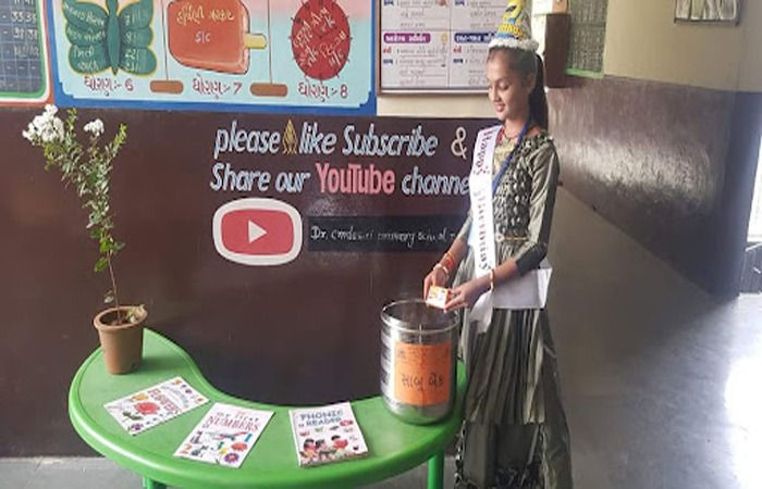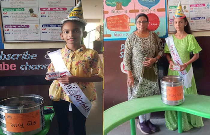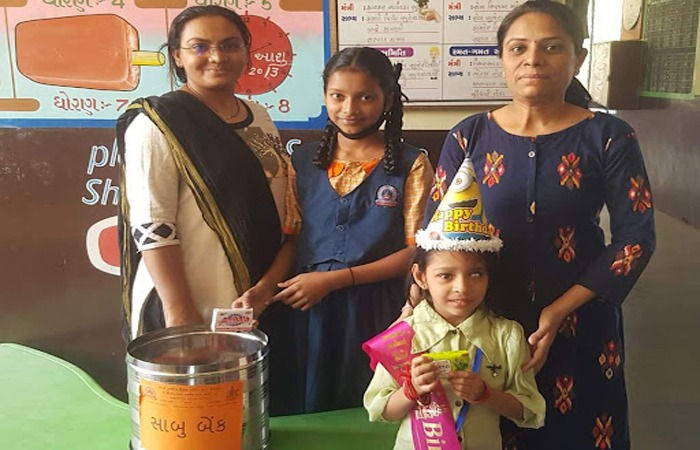 બર્થ ડે ગર્લ બર્થડેની ઉજવણી માટે શાળામાં ચોકલેટ કે કેક નથી લાવતી પરંતુ સાબુ લાવે છે અને પક્ષીઓ માટેના ચણ લાવે છે. આ શાળા દ્વારા કોરોના બાદ સાબુ બેંક ઉભી કરવામાં આવી છે તેમાં સાબુ દાન કરવામા આવે છે જ્યારે પક્ષીઓ ના માટે ચણદાન બેંક ઉભી કરવામાં આવી છે તેમાં યથા શક્તિ ચણ પણ આપે છે.