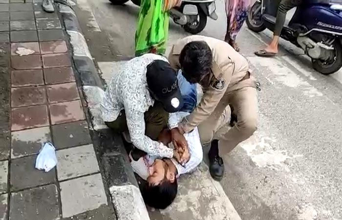 પીપલોદ વિસ્તારમાં ફરજ બજાવી રહેલા પોલીસ જવાનની સરાહનીય કામગીરી જોઈ પસાર થતાં લોકો આશ્ચર્યમાં પડયા હતા. મળતી માહીતી મુજબ એસવીએનઆઇટી સર્કલ નજીક એક યુવક દોડતા દોડતા રસ્તો ક્રોસ કરવા જઈ રહ્યો હતો. જો કે તે દરમ્યાન તેને ખેંચ આવતા તે પડી ગયો હતો અને તેને લઈને તેને માથાના ભાગે ઈજા પણ થઈ હતી. જો કે તે સમયે સમય સૂચકતા વાપરી ટ્રાફિક શાખાના રિજીયન-૩ માં ફરજ બજાવતા જીતેશ જીવાભાઈ નામના જવાન મદદે દોડી આવ્યા હતા. એમ્બ્યુલન્સ આવે એ પહેલા બેભાન થયેલા યુવકની છાતીમાં તેમણે હાર્ટ પમ્પિંગ આપવાનું કામ કર્યું હતું. પોલીસ જવાનની મદદે રાહદારી પણ આવ્યા હતા. એક રાહદારીએ પણ ઈજાગ્રસ્તના હાથ ગરમ રાખવમાં મદદ કરી હતી. ત્યારબાદ ઈજાગ્રસ્તને તાત્કાલિક ૧૦૮ ની મદદથી સારવાર અર્થે હોસ્પિટલ ખસેડવામાં આવ્યો હતો. આ વીડિયો સોશિયલ મીડિયામાં વાઇરલ થતાં શહેરીજનો આ પોલીસ જવાનની ખૂબ પ્રશંસા કરી રહ્યા છે તો બીજી તરફ શહેર ટ્રાફિક શાખાના ડીસીપી દ્વારા પણ પોલીસ જવાનની કામગીરીને બિરદાવવામાં આવી હતી.