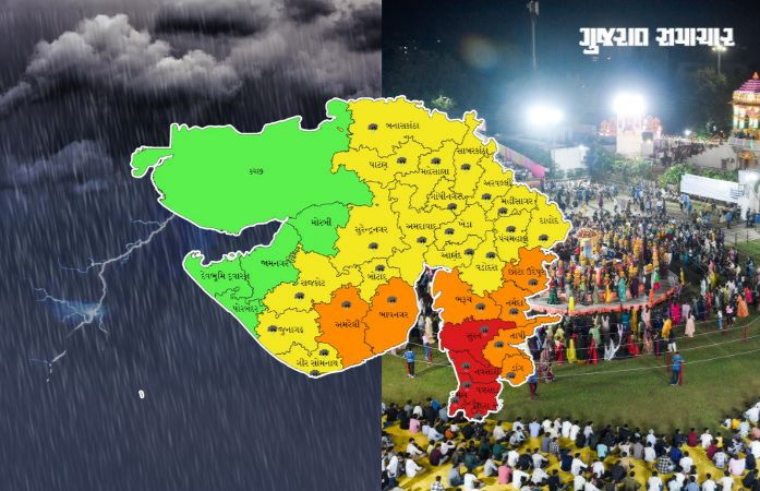 Rain Forecast Gujarat : ગુજરાતમાં ચોમાસાની વિદાય સમયે સૌરાષ્ટ્ર અને દક્ષિણ ગુજરાત સહિતના વિસ્તારોમાં ભારે વરસાદી માહોલ છે. નવરાત્રિમાં વરસાદ વરસતાં ખેલૈયાઓના રંગમાં ભંગની સ્થિતિ સર્જાઈ છે. તેવામાં હવામાન વિભાગે આગામી ચાર દિવસ ભારેથી અતિભારે વરસાદને લઈને યલો, ઑરેન્જ અને રેડ ઍલર્ટ જાહેર કર્યુ છે. જેમાં 28-29 સપ્ટેમ્બરે 20થી વધુ જિલ્લામાં અતિભારે વરસાદનું ઍલર્ટ જાહેર કર્યુ છે.