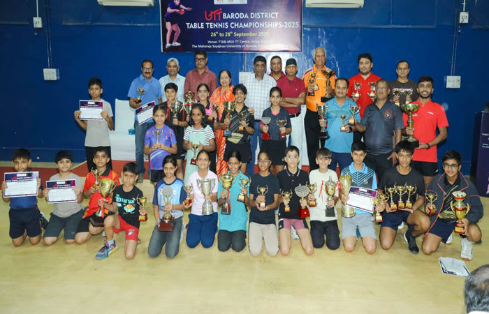 ટેબલ ટેનિસ એસોસિએશન ઓફ બરોડા દ્વારા તા. 26થી 28 સપ્ટેમ્બર દરમ્યાન એમએસ યુનિવર્સિટી પેવેલિયન ખાતે યુટીટી બરોડા જિલ્લા ટેબલ ટેનિસ ચેમ્પિયનશિપ -2025નું આયોજન કરાયું હતું. જેમાં 310 એન્ટ્રીઓ પ્રાપ્ત થતા ડબલ્સ અને સિંગલ્સની વિવિધ કેટેગરીમાં 17 ઇવેન્ટ્સ યોજાઇ હતી. તમામ મુકાબલા નૉક આઉટ પદ્ધતિના આધારે યોજાયા હતા. જેમાં પ્રથમ મદલાણી અને મહેક શેઠએ મેન્સ - વિમેન્સ સિંગલ્સનો ખિતાબ હાંસિલ કર્યો હતો. જ્યારે અંડર 17- 19 મેન્સ સિંગલ્સમાં વેદ પંચાલે ડબલ ક્રાઉન હાંસિલ કર્યા હતા.